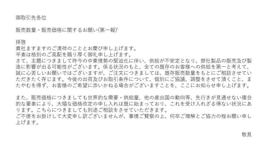 2026年3月現在、イランとアメリカ、イスラエルの戦争の終焉が見えません。切削油、工業用潤滑油を製造販売している弊社でもサプライヤーからの原料不足からの大幅な価格改定や出荷制限、出荷ストップが相次いでいます。そんな中お客[…..]